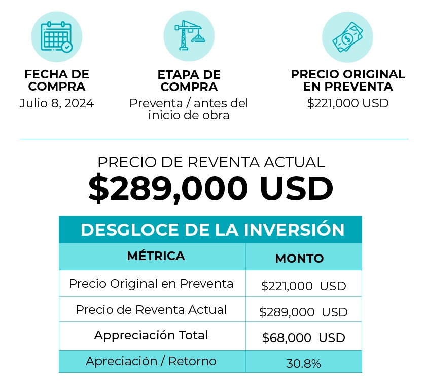 Un comprador que adquirió una residencia de 2 recámaras y 2 baños por $221,000 USD antes del inicio de obra hoy observa un valor de reventa de $289,000 USD, generando $68,000 USD en apreciación y un retorno del 30.8%.