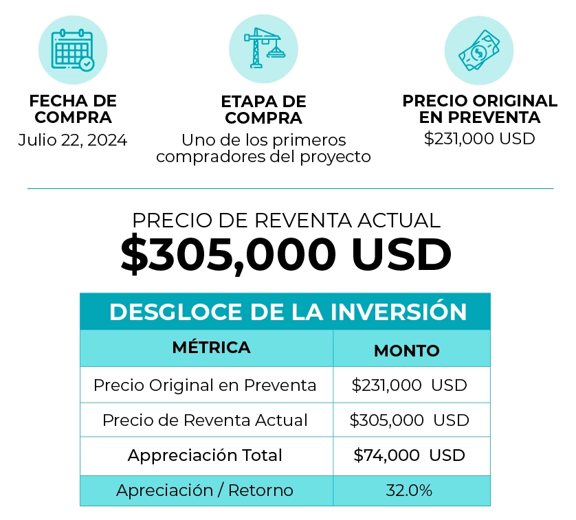 Otro comprador que adquirió una residencia de 2 recámaras y 2 baños con alberca privada y jardín por $231,000 USD en la etapa más temprana del proyecto hoy observa un valor de reventa de $305,000 USD, generando $74,000 USD en apreciación y un retorno del 32.0%.