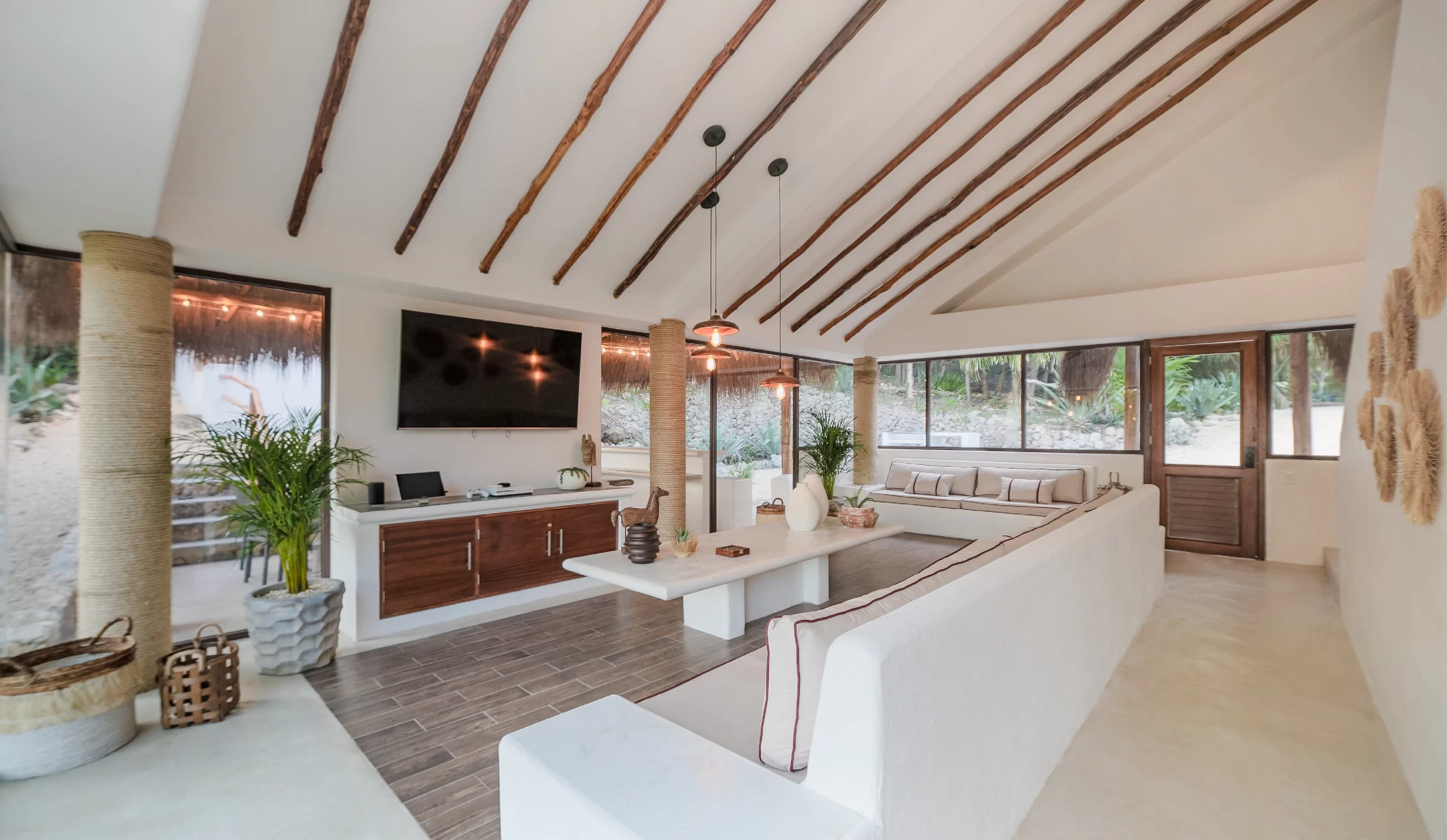 The open layout is designed for both entertaining and relaxing, with stylish furnishings and a bright, tropical feel throughout.
